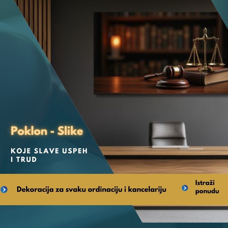 Slike na platnu sa pravnim motivima, profesionalna dekoracija za advokatske kancelarije, poklon za diplomiranje, pravosudni ispit i jubileje. U svetu gde reč ima težinu, a znanje predstavlja moć, ovaj motiv sudijskog čekića i knjiga stoji kao podsetnik na vrednosti pravde i reda. Pažljivo odabrani tonovi drveta i klasična kompozicija unose dozu profesionalizma i autoriteta u svaki radni prostor. Ova slika na platnu nije samo dekoracija; ona je vizuelna potvrda stručnosti i posvećenosti pozivu. Bilo da opremate sopstvenu kancelariju ili tražite dar koji odiše poštovanjem, ovaj klasični pravni motiv je nepogrešiv izbor koji nikada ne izlazi iz mode.Tražiš originalan način da nekoga obraduješ? Evo zašto je ova slika idealan poklon: Ovo je dar koji pokazuje da cenite nečiji trud, integritet i godine posvećenosti zakonu. Savršena je za:Poklon za diplomiranje ili položen pravosudni ispit: Krunišite godine učenja i najteži ispit u karijeri simbolom koji će krasiti prvu kancelariju mladog kolege.Opremanje nove advokatske ili notarske kancelarije: Detalj koji trenutno podiže nivo profesionalizma i uliva poverenje klijentima čim prekorače prag.Jubileje, odlaske u penziju ili znak zahvalnosti: Idealan način da kolegama ili mentorima izrazite poštovanje za godine službe i doprinos pravnoj struci.Rođendanski poklon za sudije i pravnike: Za ljude koji žive svoj poziv, ova slika je priznanje njihovom svakodnevnom radu i nepokolebljivom autoritetu.Gde bi trebalo da stoji ova slika? Zbog svoje ozbiljne tematike i neutralnih boja, najbolje će se uklopiti u:Advokatsku kancelariju ili notarsku kancelariju: Direktno iza radnog stola ili u zoni za prijem klijenata, gde postaje deo vašeg profesionalnog identiteta.Čekaonice pravnih službi: Kako bi klijentima odmah bilo jasno da se nalaze na mestu gde se poštuje zakon, red i stručnost.Konferencijske sale i sudnice: Gde god se donose važne odluke, ovaj motiv dodaje potrebnu težinu i ozbiljnost atmosferi.Kućni radni kabinet: Za kreiranje ambijenta koji inspiriše na fokus, duboko razmišljanje i intelektualni rad.Neka ovaj simbol pravde na tvom zidu bude tvoj svakodnevni podsetnik da istina i znanje uvek imaju poslednju reč.