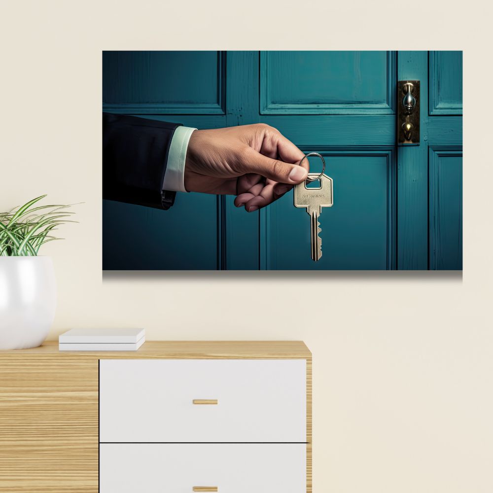 Ova slika prikazuje trenutak koji svako pamti – onaj momenat kada primiš ključ od novog doma, od svoje prve nekretnine ili prostora u kojem počinje neka nova životna priča. Ruka koja pruža ključ ispred prelepih plavih vrata simbolizuje poverenje, nove početke, sigurnost i sve one male nade i planove koji stanu u jedan ključ.